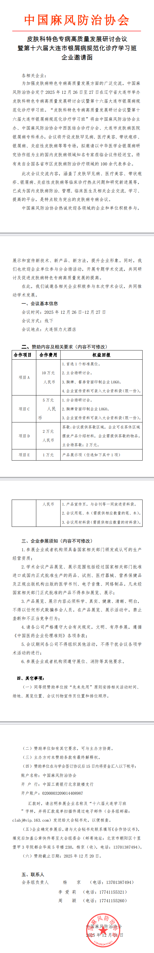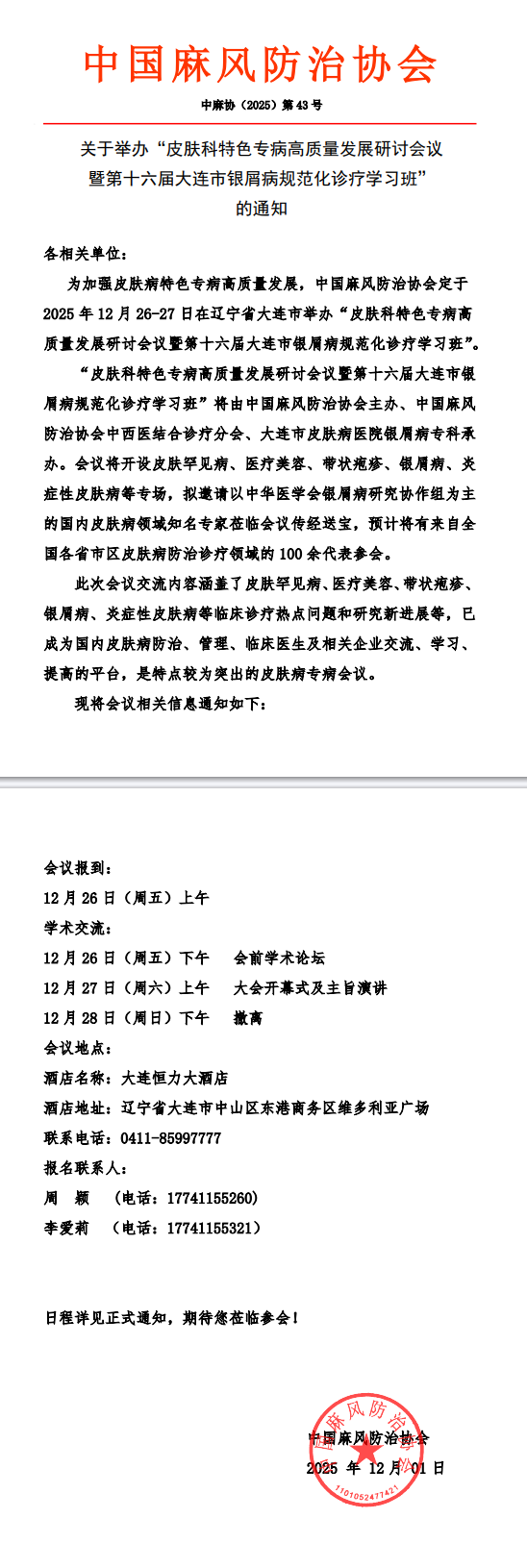皮肤科特色专病高质量发展研讨会议暨第十六届大连市银屑病规范化诊疗学习班会议通知及企业招商函